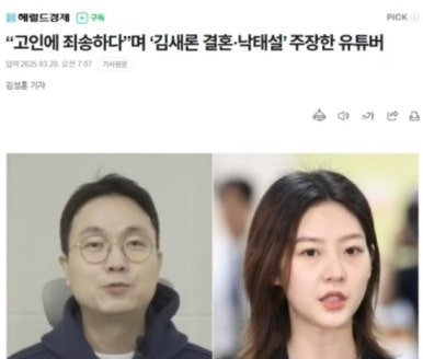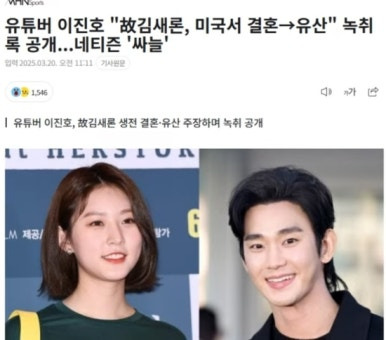 최근(오늘 20일) 유튜버 이진호가 김새론과 관련된 결혼 및 낙태 의혹을 유튜브 영상에 공개하며 큰 논란을 일으켰습니다. 이진호는 김새론이 웨딩 화보를 SNS에 올렸을 당시 이미 미국에서 결혼한 상태였다고 주장했습니다. 그는 매니저 A와의 통화 녹취록을 공개하며 "여성이 이미 결혼했다고 말했다"는 내용을 강조했습니다.