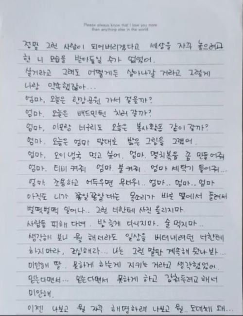 최근 유튜브 채널 '가로세로연구소(가세연)'를 통해 고(故) 김새론 씨의 어머니가 작성한 자필 편지가 공개되어 많은 이들의 마음을 아프게 하고 있습니다. 이 편지는 딸을 잃은 어머니의 애끓는 심정을 담고 있으며, 그 내용은 깊은 슬픔과 그리움, 그리고 주변 사람들에 대한 감사와 미안함으로 가득 차 있습니다.